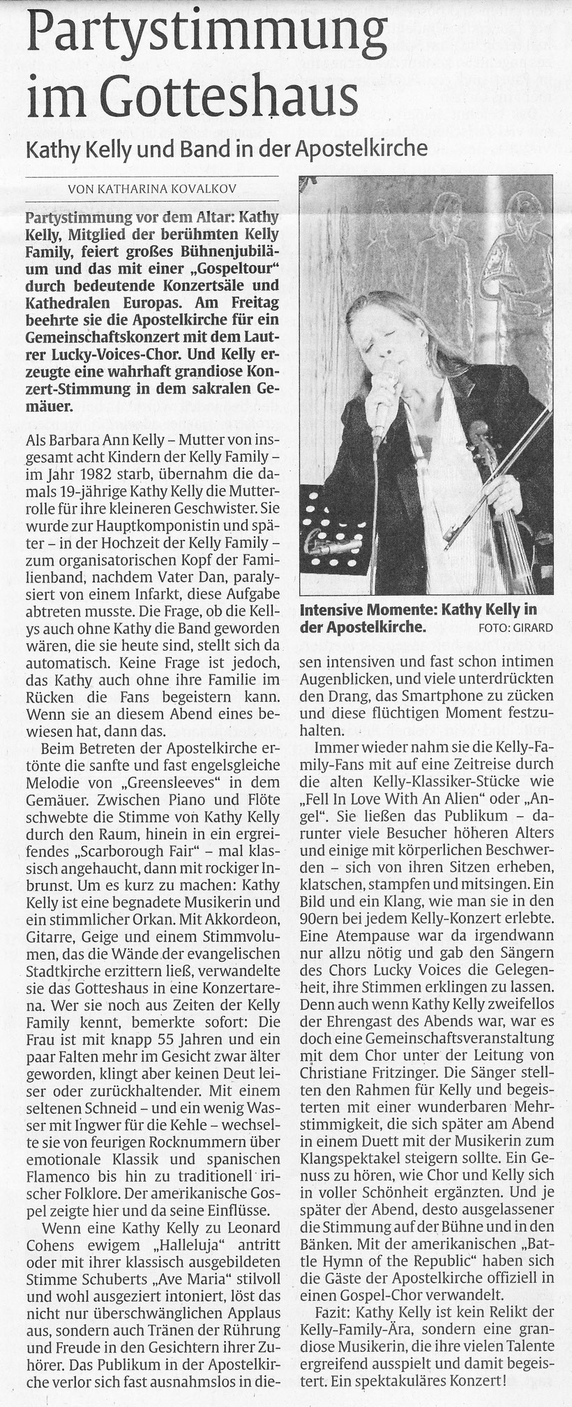 Der Hauptstar des Abends bot Balladen, ernste und feurige Songs, viele bekannte und neu interpretierte Gospels, Spirituals und Traditionals aus seinen zwei Hit-Alben „Morning of My Life“ und „Godspel“ (was ein d ausmachen kann). Kathy Kelly trat routiniert und nachdrücklich mit ordentlich Drive im Leib auf und sang sich ebenfalls mit zunächst getragenen ruhigen Melodien aus Irland und anderen Ländern - auch deutschsprachig - zu einem traumhaften Ave Maria nach Beyoncé hoch. Ab diesem Punkt begann dann auch ihr Blut zu kochen, und eine Reihe extrem dynamischer Songs, Polkas und sogar einem Schunkellied von Spanien bis Bayern/Österreich machten dann erst einmal ein Fass auf. Die Dynamik hielt auch im zweiten Teil an, unterbrochen mit ernsteren Liedern wie Leonard Cohens "Hallelujah" oder "Die schwarze Frau", eine traurige Ballade über eine schwarze Frau in Irland lebend, die von ihrem Kind getrennt wurde. Die Krönung war der Schlusssong "Guten Abend, gute Nacht", der ja Hunderttausende von deutschen Kindern in der Schule beschäftigt und nie mehr loslässt. Kathy hat nicht nur eine sehr ausgebaute und herausragende Stimme hoher Qualität, sie spielt auch mehrere Instrumente, hier Gitarre, Violine und Akkordeon. Begleitet wird sie auf ihrer Tour 2018/2019 von einem neuen Keyboarder. In Kaiserslautern noch am Piano unterstützend Christiane Fritzinger, an der Gitarre Sepp Stephan und auf dem Cajon Jan Schowaller. Ein schöner stimmungsvoller Abend, der sich zwischen Entspannung, Kontemplation und Tanzlust herrlich entfaltete.